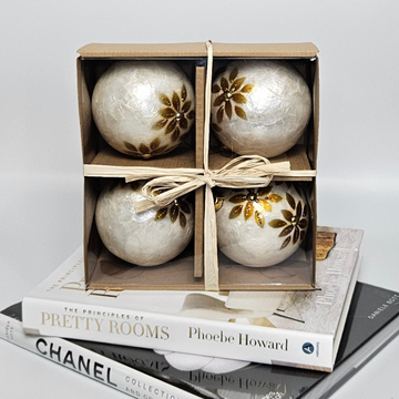 Elegant Christmas Ornaments Set of 4 – Ivory Pearl with Bronze Daisy Design Festive Holiday Decorations